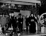 Description :11 HOMMES ET 2 FEMMES POSANT AVEC M. LE CURE BIRON SUR UNE ESTRADE; DEVANT EUX, DES JOUETS D'ENFANTS ET UNE ROUE CHANCEUSE.