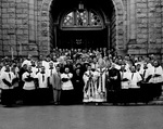 Description :69 GARCONS PORTANT A LEUR BOUTONNIERE UN RUBAN POSENT AVEC 5 RELIGIEUX DONT LE CURE BIRON ET L'ABBE EDMOND LEMIRE, SUR LE PORTIQUE DE L'EGLISE ST-JEAN-BAPTISTE.