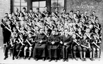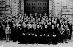 Description :78 GARCONS TENANT CHACUN UN CERTIFICAT ET PORTANT UN RUBAN A LEUR BOUTONNIERE POSENT AVEC 2 RELIGIEUX ET UN LAIC SUR LE PORTIQUE DE L'EGLISE ST-JEAN-BAPTISTE.