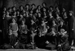 Description :30 FILLETTES PORTANT UN COSTUME (EN HAUT, 2e A GAUCHE, MICHELINE BUREAU) POSENT AVEC MME LAURENCELLE ET SA FILLE (SOEUR) LAURENCE LAURENCELLE, ASSISE AU CENTRE AVEC UN TAMBOURIN.