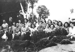 Description :22 FEMMES ACCROUPIES DEVANT UN BOSQUET. A L'ARRIERE DU GROUPE: A GAUCHE DES BOULEAUX, A DROITE UN HOMME DEBOUT. 1ERE RANGEE: COLETTE LEBLANC. EXTREME GAUCHE JUSQU'A CHEMISIER FLEURI (INCLUS PERSONNES MI-RANG): IDA GOYETTE, MARIETTE BLAIS, THER...