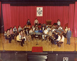 Description :PRISE EN PLONGEE SUR 14 MUSICIENS DE L'HARMONIE, PLACES EN DEMI-CERCLE ET EN 2 RANGS SUR UNE SCENE. ILS SONT EN REPETITION. MARCEL MARCOTTE, DIRECTEUR EST DEBOUT A L'EXTREME DROITE.