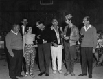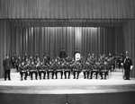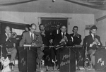 Description :GROUPE DE PERSONNES EN DISCUSSION A L'AVANT D'UN ORCHESTRE A L'INTERIEUR D'UN BATIMENT. MARCEL MARCOTTE, DEBOUT, A L'EXTREME DROITE.