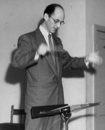 Description :PHOTOGRAPHIE DE PIED EN CAP DE MARCEL MARCOTTE EN TRAIN DE DIRIGER DEVANT UN LUTRIN.