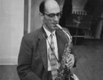 Description :PHOTOGRAPHIE EN BUSTE DE MARCEL MARCOTTE JOUANT DU SAXOPHONE. IL EST DANS UNE SALLE.