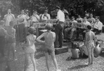 Description :16 MUSICIENS JOUENT EN DEMI-CERCLE, EN 2 RANGS A L'EXTERIEUR. MARCEL MARCOTTE, DIRECTEUR, EST DEBOUT, DE DOS ET DE CENTRE VERS LA DROITE DE LA PHOTO. LA SCENE SE PASSE LORS DU PIQUE-NIQUE ANNUEL DE L'INGERSOLL-RAND. DES ENFANTS EN COSTUME DE B...