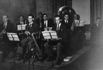 Description :6 MUSICIENS JOUENT EN DEMI-CERCLE DANS UNE SALLE D'HOTEL. MARCEL MARCOTTE JOUE DU SAXOPHONE. IL EST LE TROISIEME A PARTIR DE LA GAUCHE. DE GAUCHE A DROITE: GARANT, GILLES; CHARRON, CAMILLE; COLEY, JIMMY; BOUDREAU, ROGER; GARANT, CAMILLE.
