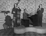 Description :QUATRE MUSICIENS JOUENT DANS LA SALLE DE L'HOTEL. MARCEL MARCOTTE JOUE DE LA CLARINETTE. IL EST LE PREMIER A PARTIR DE LA DROITE. DE GAUCHE A DROITE: GARANT, SERGE; PAGE, PHIL; LEANAGAN, JACK.