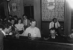 Description :PLUSIEURS PERSONNES RASSEMBLEES PRES D'UN PIANO DISCUTENT ET ECOUTE UN PIANISTE DE MUSIQUE POPULAIRE. A L'ARRIERE PLAN, SUR LE MUR, ON PEUT VOIR UN ECUSSON IDENTIFIE ®WARWICK¯ ET UN AUTRE IDENTIFIE ®FARNHAM¯.