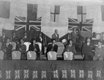 Description :13 MUSICIENS POSENT EN 2 RANGS HORIZONTAUX. ILS SONT SUR UNE ESTRADE ENTOUREE DE DRAPEAUX BRITANNIQUES. MARCEL MARCOTTE, SAXOPHONE, EST AU CENTRE. DE GAUCHE A DROITE: MARCEL CHATEAUNEUF, JEAN ROUSSEAU, JEAN-PAUL BELISLE, HARRY TINKER; PAUL MET...