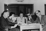 Description :5 PERSONNES SONT AUTOUR D'UNE TABLE A LA STATION DE RADIO CHLT. MARCEL MARCOTTE EST LE PREMIER A PARTIR DE LA DROITE. PAUL-MARCEL ROBIDOUX ET SA FEMME SONT AUSSI PRESENTS.