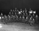 Description :32 MUSICIENS POSENT EN QUART DE CERCLE, EN 4 RANGS. MARCEL MARCOTTE, DIRECTEUR, EST LE 5EME DE LA 3EME RANGEE A PARTIR DE LA DROITE. SYLVIO LACHARITE EST LE 4EME DE LA 3EME RANGEE A PARTIR DE LA DROITE. LE PLAFOND EST ORNE DE RUBANS DE CREPE D...