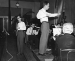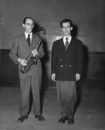 Description :ENVIRON UNE QUINZAINE DE MUSICIENS JOUENT EN DEMI-CERCLE, EN QUELQUES RANGS. MARCEL MARCOTTE, SOLISTE, JOUE DU SAXOPHONE. HARRY LONG, DIRECTEUR, EST DECENTRE VERS LA DROITE.