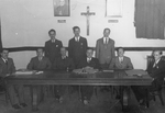 Description :NEUF PERSONNES POSENT AUTOUR D'UNE TABLE. MARCEL MARCOTTE EST LE PREMIER A PARTIR DE LA DROITE. SYLVIO LACHARITE EST LE DEUXIEME A PARTIR DE LA GAUCHE. EN ARRIERE-PLAN, SUR LE MUR, ON APERCOIT LES PHOTOS DE MGR DESRANLEAU ET DE MGR O.GAGNON DE...