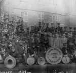 Description :35 MUSICIENS PRENNENT LA POSE, EN UNIFORME ET AVEC LEURS INSTRUMENTS, DEVANT LE "CENTRAL SCHOOL". SUR LE TAMBOUR, ON PEUT LIRE: "LIBERTY BAND & ORCHESTRA SHERBROOKE". ASSIS, DE GAUCHE A DROITE, 3EME: LEO LALIBERTE, 4EME: GEORGES SYLVESTRE.