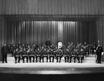 Description :39 MEMBRES DE L'HARMONIE EN UNIFORME ET AVEC LEURS INSTRUMENTS PRENNENT LA POSE SUR LA SCENE D'UN THEATRE. A L'EXTREME GAUCHE, LE CHEF D'ORCHESTRE MARCEL MARCOTTE. GUY BUREAU, DEBOUT A L'EXTREME DROITE. GASTON LALIBERTE, 2e RANGEE, 2e A GAUCHE...