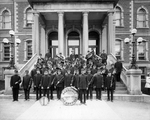 Description :43 MEMBRES DE L'HARMONIE DE SHERBROOKE, EN UNIFORMES ET AVEC LEURS INSTRUMENTS PRENNENT LA POSE DANS LES ESCALIERS EXTERIEURS DE L'ENTREE PRINCIPALE DE L'ANCIEN PALAIS DE JUSTICE. EN AVANT, IL Y A UN TAMBOUR SUR LEQUEL EST INSCRIT: "HARMONIE D...