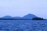 Description :LA PHOTO EST PRISE SUR LE LAC FACE A UNE ILE REMPLIE D'ARBRES; DERRIERE S'ELEVE LE MONT OLW'S HEAD.