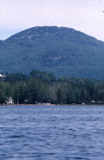 Description :LA PHOTO EST PRISE SUR LE LAC. AU PREMIER PLAN, ON APERCOIT UN PETIT VOILIER, AU LOIN ON VOIT L'ILE RONDE ET LE MONT OWL'S HEAD.