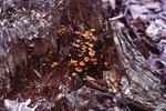 Description :DES CHAMPIGNONS SONT COLLES A UNE SOUCHE.