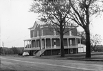 Description :VUE DE FACE DU RESTAURANT CHATEAUGUAY SITUE RUE GALT OUEST. BATIMENT DE STYLE CUBIQUE AVEC TOUR QUEEN ANNE.