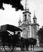 Sujet principal :CALECHE PASSANT DEVANT L'EGLISE ST-JEAN-BAPTISTE