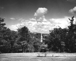 Description :PAYSAGE AYANT COMME POINT CENTRAL LE CLOCHER DE LA PLYMOUTH CHURCH. AU LOIN DERRIERE, L'HOPITAL ST-VINCENT-DE-PAUL. PHOTO PRISE A PARTIR DE LA RESIDENCE ROCKMOUNT, RUE MOORE.