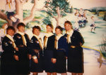 Description :6 FEMMES DEBOUT POUR LA POSE. DERRIERE, UNE MURALE REPRESENTANT UNE RONDE EN ACTION. A L'ENDOS, LES NOMS DE MARTINE ET BRIGITTE DUGAL, CECILE ROY, FRANCE PLANTE, LUCIE (BAZIN?).