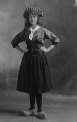 Description :UNE JEUNE FILLE PREND LA POSE EN COSTUME D'EPOQUE. ELLE A LES MAINS SUR LES HANCHES, PORTE DES SABOTS DE TISSU ET UNE LARGE TOQUE.