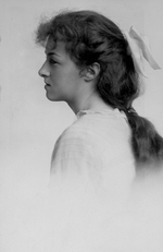 Description :PHOTOGRAPHIE EN BUSTE ET DE PROFIL DE LUCIENNE VERRET VERS L'AGE DE DIX-HUIT ANS. ELLE A UN NOEUD DANS LES CHEVEUX. ELLE A AU COU, UNE CHAINE AVEC UN PENDATIF ET ELLE PORTE UNE BROCHE SUR UN JABOT DE DENTELLE.