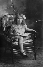 Description :UNE PETITE FILLE EST ASSISE DANS UNE CHAISE, UN LIVRE SUR LES GENOUX. ELLE PORTE UNE BARBOTEUSE ET A UN NOEUD BLANC DANS LES CHEVEUX.
