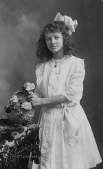 Description :PHOTO DE STUDIO. LUCIENNE VERRET SE TIENT DEBOUT PRES D'UNE TABLE ET TIENT UNE CORBEILLE DE FLEURS. ELLE A LES CHEVEUX BOUCLES, PORTE UN NOEUD DANS SES CHEVEUX, ET UNE JOLIE ROBE AVEC UN RUBAN EN GUISE DE CEINTURE.