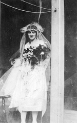Description :UNE JEUNE FEMME SE TIENT DEBOUT EN ROBE DE MARIEE SUR LE PERRON D'UNE MAISON.