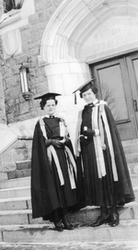 Description :2 JEUNES FILLES EN COSTUME DE GRADUEES POSENT SUR LE PORTIQUE D'UNE INSTITUTION. DE GAUCHE A DROITE: GRAZIELLA DUVAL, SUZANNE BRUNELLE.