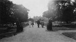 Description :DES PIETONS SE PROMENENT DANS UNE ALLEE JALONNEE DE HAIES DE FLEURS.