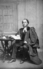 Description :ALBERT EDOUARD BECKETT REVETUE D'UNE TOGE, ASSIS A UNE TABLE DE TRAVAIL.