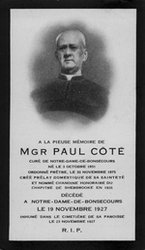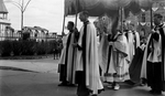 Description :MGR PHILIPPE DESRANLEAU EST ACCOMPAGNE DE HUIT AUTRES MEMBRES DU CLERGE. ILS SONT DEVANT LA CATHEDRALE ST-MICHEL EN CONSTRUCTION. DES BANDEROLES SONT SUSPENDUES A LA CONSTRUCTION ET A L'EVECHE.