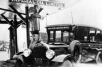 Description :A DROITE, UNE VOITURE DU NEW WELLINGTON HOTEL PORTANT LES MOTS "J.O.GAGNE, PROP.". A GAUCHE, LA STATION D'ESSENCE IMPERIAL SUR LA RUE BELVEDERE SUD. ELLE POSSEDE DES POMPES D'CA DIX PIEDS DE HAUT.