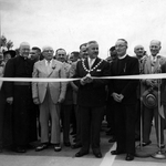 Description :DES NOTABLES DE LA VILLE ACCOMPAGNENT LE MAIRE J.EMILE LEVESQUE POUR COUPER LE RUBAN SYMBOLIQUE LORS DE L'INAUGURATION OFFICIELLE DU PONT. AU PREMIER RANG, DEUX MEMBRES DU CLERGE DONT MGR RAOUL BRUNEAU, CURE DE LA PAROISSE ST-JOSEPH. DANS LA D...