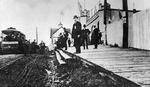 Description :UN QUAI EST INSTALLE A L'EXPOSITION AGRICOLE OU DES HOMMES ATTENDENT L'ARRIVEE DU TRAMWAY. CELUI-CI ARRIVE, PORTANT LA MENTION "EXIBITION GATE". IL S'AGIT D'UN TRAMWAY D'ETE.