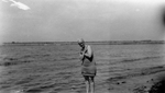 Description :UNE JEUNE FEMME EST AU BORD DE L'EAU PORTANT MAILLOT ET CASQUE DE BAIN.