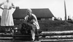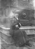 Description :MME F.-X. LEMIEUX VERS L'AGE DE 80 ANS. ELLE EST ASSISE DANS UNE CHAISE, SUR UNE GALERIE.