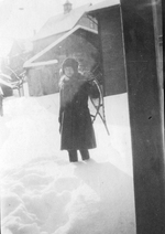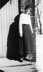 Description :PORTRAIT DE PIED EN CAP DE LUCIENNE VERRET VERS L'AGE DE DIX-HUIT ANS. ELLE PREND LA POSE SUR LE SEUIL D'UNE BATISSE; ELLE PORTE UN BLOUSON, UNE JUPE LONGUE BOUTONNEE ET DES SOULIERS PLATS.