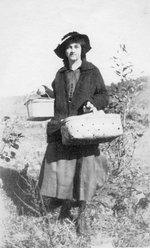 Description :ON VOIT LUCIENNE VERRET DEBOUT DANS UN CHAMP. ELLE TIENT 2 PANIERS A PROVISIONS. ELLE PORTE UN CHAPEAU, UN GILET, UNE JUPE LONGUE ET DES BOTTILLONS.