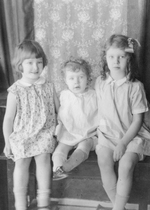 Description :TROIS ENFANTS AGES D'CA 1 A 4 ANS SONT ASSIS SUR UN BANC DEVANT LES DRAPERIES D'UNE FENETRE. DE GAUCHE A DROITE: FRANCOISE, ANDREE ET IRENE DESILETS.
