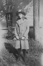 Description :UNE JEUNE FILLE DE 16 ANS CA VETUE D'UN COSTUME DEUX-PIECES ET COIFFEE D'UN CHAPEAU PREND LA POSE DEVANT UNE MAISON. ELLE TIENT SES GANTS DANS SES MAINS.