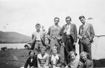 Description :UN GROUPE D'ADOLESCENTS (5 FILLES ASSISES ET 4 GARCONS DEBOUT) PRENNENT LA POSE. DERRIERE EUX, IL Y A UNE AUTOMOBILE STATIONNEE SUR LE BORD D'UN LAC: UNE TENTE EST MONTEE DERRIERE LE GROUPE.