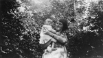 Description :JEAN DESILETS A SIX MOIS DANS LES BRAS DE SA MERE LUCIENNE VERRET. ILS SONT DANS UN BOISE.
