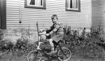 Description :UN GARCONNET EN CULOTTES COURTES SE TIENT SUR UNE BICYCLETTE.