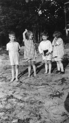 Sujet principal :LES ENFANTS DESILETS ET LEUR COUSINE EN FACE DU CHALET DU LAC MASSAWIPPI.